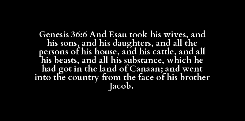 Genesis 36:6 And Esau took his wives, and his sons, and his daughters, and all the persons of his house, and his cattle, and all his beasts, and all his substance, which he had got in the land of Canaan; and went into the country from the face of his brother Jacob.
