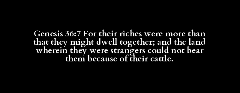 Genesis 36:7 For their riches were more than that they might dwell together; and the land wherein they were strangers could not bear them because of their cattle.