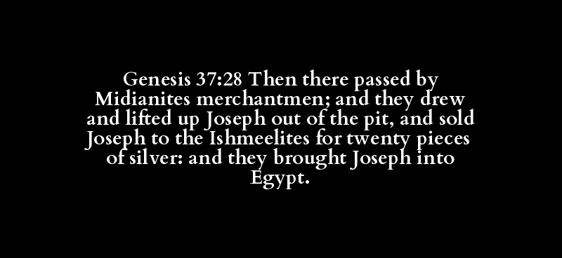 Genesis 37:28 Then there passed by Midianites merchantmen; and they drew and lifted up Joseph out of the pit, and sold Joseph to the Ishmeelites for twenty pieces of silver: and they brought Joseph into Egypt.