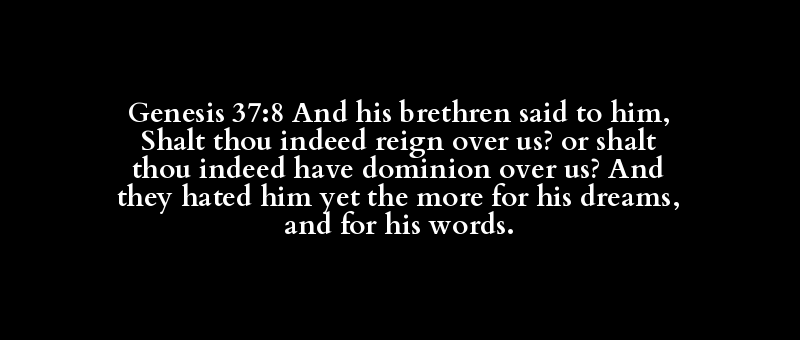 Genesis 37:8 And his brethren said to him, Shalt thou indeed reign over us? or shalt thou indeed have dominion over us? And they hated him yet the more for his dreams, and for his words.