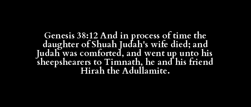 Genesis 38:12 And in process of time the daughter of Shuah Judah's wife died; and Judah was comforted, and went up unto his sheepshearers to Timnath, he and his friend Hirah the Adullamite.