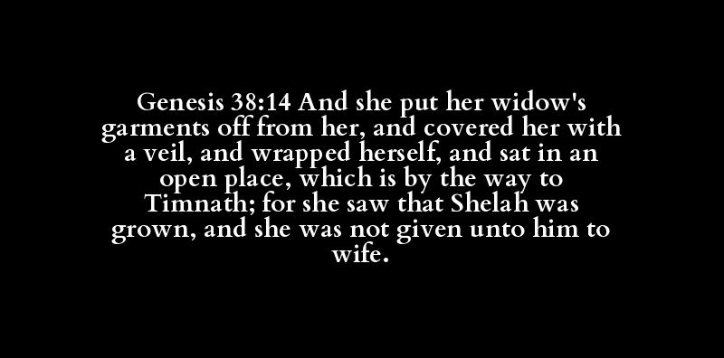 Genesis 38:14 And she put her widow's garments off from her, and covered her with a veil, and wrapped herself, and sat in an open place, which is by the way to Timnath; for she saw that Shelah was grown, and she was not given unto him to wife.