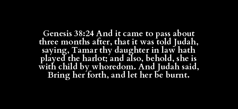 Genesis 38:24 And it came to pass about three months after, that it was told Judah, saying, Tamar thy daughter in law hath played the harlot; and also, behold, she is with child by whoredom. And Judah said, Bring her forth, and let her be burnt.