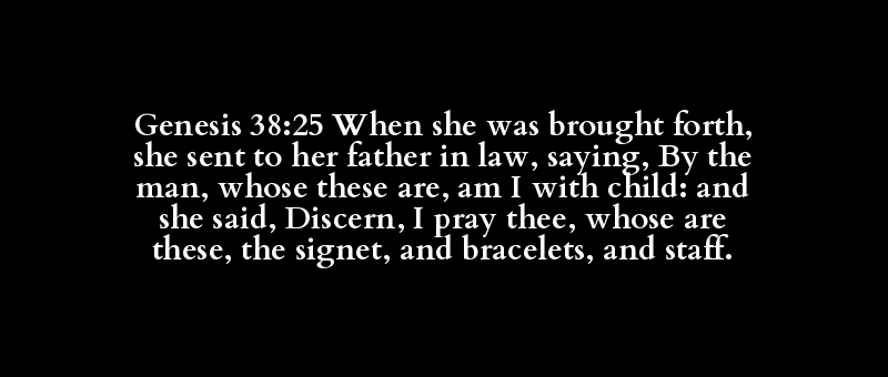 Genesis 38:25 When she was brought forth, she sent to her father in law, saying, By the man, whose these are, am I with child: and she said, Discern, I pray thee, whose are these, the signet, and bracelets, and staff.