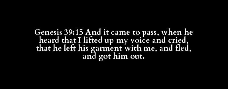 Genesis 39:15 And it came to pass, when he heard that I lifted up my voice and cried, that he left his garment with me, and fled, and got him out.