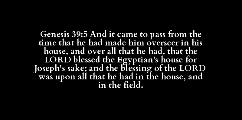 Genesis 39:5 And it came to pass from the time that he had made him overseer in his house, and over all that he had, that the LORD blessed the Egyptian's house for Joseph's sake; and the blessing of the LORD was upon all that he had in the house, and in the field.