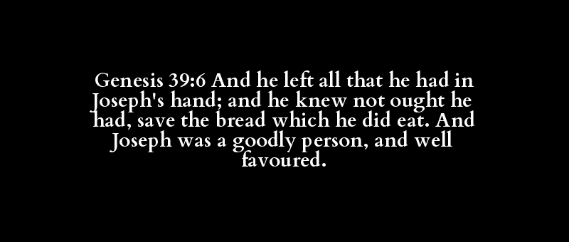 Genesis 39:6 And he left all that he had in Joseph's hand; and he knew not ought he had, save the bread which he did eat. And Joseph was a goodly person, and well favoured.