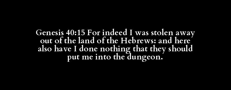 Genesis 40:15 For indeed I was stolen away out of the land of the Hebrews: and here also have I done nothing that they should put me into the dungeon.