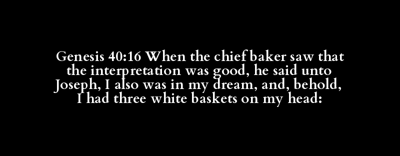 Genesis 40:16 When the chief baker saw that the interpretation was good, he said unto Joseph, I also was in my dream, and, behold, I had three white baskets on my head: