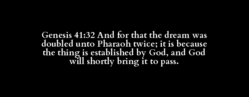 Genesis 41:32 And for that the dream was doubled unto Pharaoh twice; it is because the thing is established by God, and God will shortly bring it to pass.