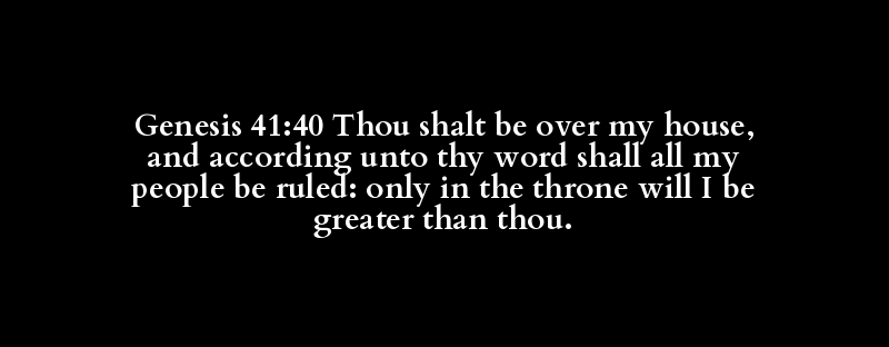 Genesis 41:40 Thou shalt be over my house, and according unto thy word shall all my people be ruled: only in the throne will I be greater than thou.