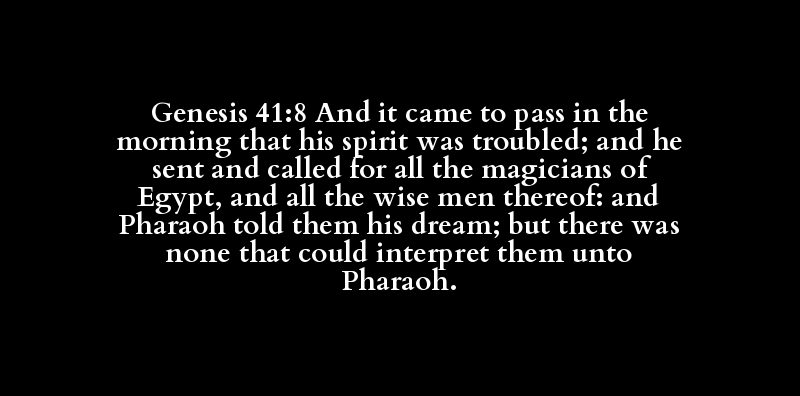Genesis 41:8 And it came to pass in the morning that his spirit was troubled; and he sent and called for all the magicians of Egypt, and all the wise men thereof: and Pharaoh told them his dream; but there was none that could interpret them unto Pharaoh.