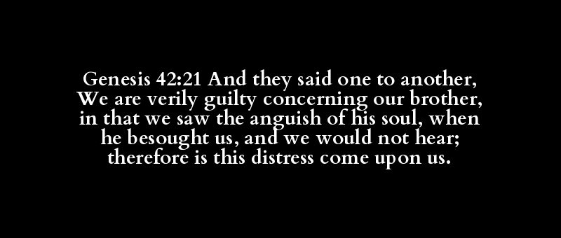 Genesis 42:21 And they said one to another, We are verily guilty concerning our brother, in that we saw the anguish of his soul, when he besought us, and we would not hear; therefore is this distress come upon us.