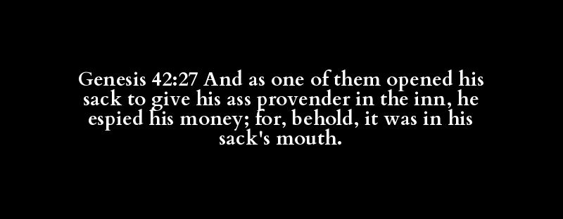 Genesis 42:27 And as one of them opened his sack to give his ass provender in the inn, he espied his money; for, behold, it was in his sack's mouth.
