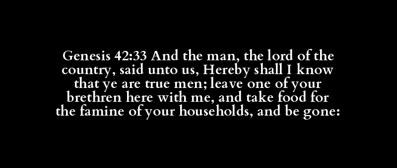 Genesis 42:33 And the man, the lord of the country, said unto us, Hereby shall I know that ye are true men; leave one of your brethren here with me, and take food for the famine of your households, and be gone: