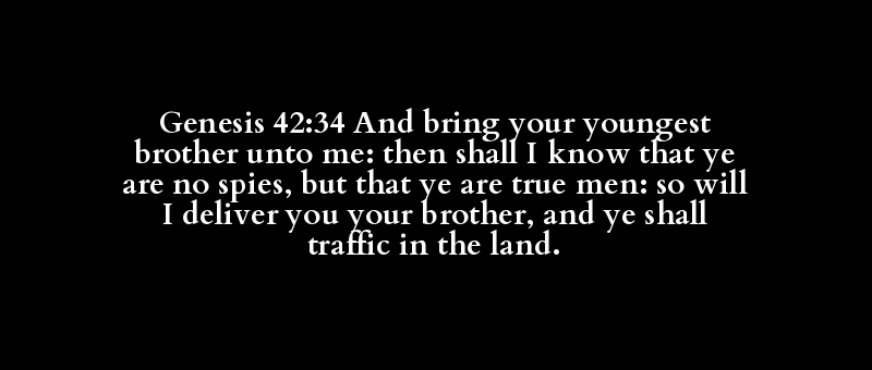 Genesis 42:34 And bring your youngest brother unto me: then shall I know that ye are no spies, but that ye are true men: so will I deliver you your brother, and ye shall traffic in the land.