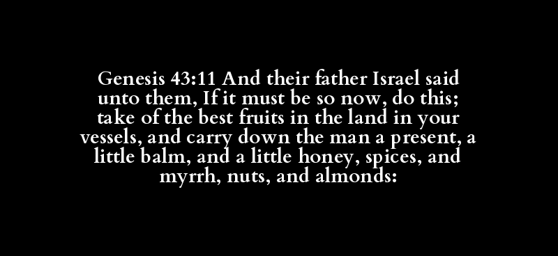 Genesis 43:11 And their father Israel said unto them, If it must be so now, do this; take of the best fruits in the land in your vessels, and carry down the man a present, a little balm, and a little honey, spices, and myrrh, nuts, and almonds: