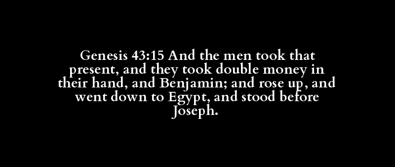 Genesis 43:15 And the men took that present, and they took double money in their hand, and Benjamin; and rose up, and went down to Egypt, and stood before Joseph.