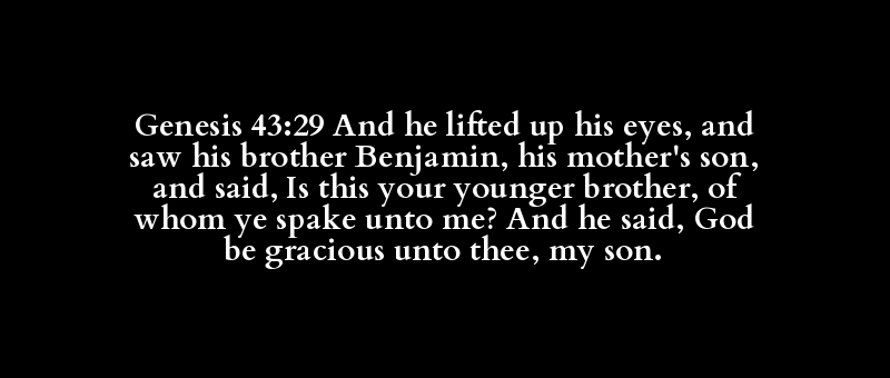 Genesis 43:29 And he lifted up his eyes, and saw his brother Benjamin, his mother's son, and said, Is this your younger brother, of whom ye spake unto me? And he said, God be gracious unto thee, my son.