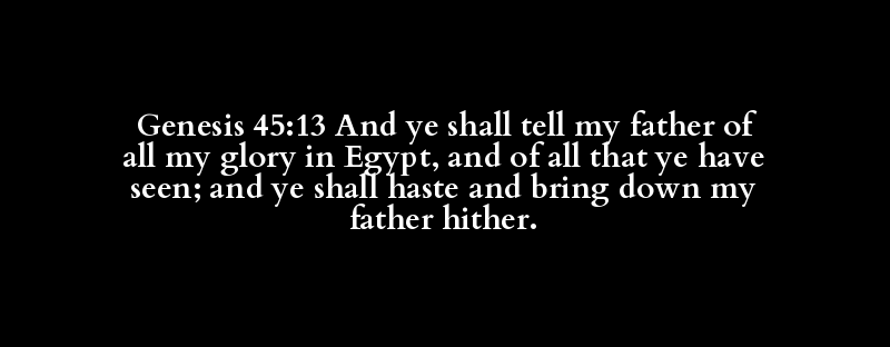 Genesis 45:13 And ye shall tell my father of all my glory in Egypt, and of all that ye have seen; and ye shall haste and bring down my father hither.