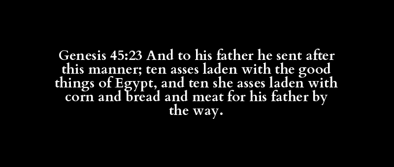 Genesis 45:23 And to his father he sent after this manner; ten asses laden with the good things of Egypt, and ten she asses laden with corn and bread and meat for his father by the way.