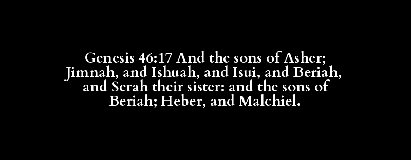 Genesis 46:17 And the sons of Asher; Jimnah, and Ishuah, and Isui, and Beriah, and Serah their sister: and the sons of Beriah; Heber, and Malchiel.