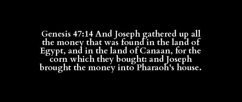 Genesis 47:14 And Joseph gathered up all the money that was found in the land of Egypt, and in the land of Canaan, for the corn which they bought: and Joseph brought the money into Pharaoh's house.