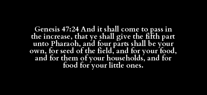 Genesis 47:24 And it shall come to pass in the increase, that ye shall give the fifth part unto Pharaoh, and four parts shall be your own, for seed of the field, and for your food, and for them of your households, and for food for your little ones.