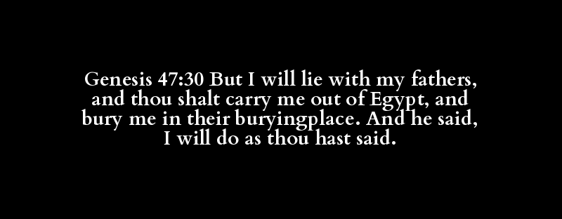 Genesis 47:30 But I will lie with my fathers, and thou shalt carry me out of Egypt, and bury me in their buryingplace. And he said, I will do as thou hast said.