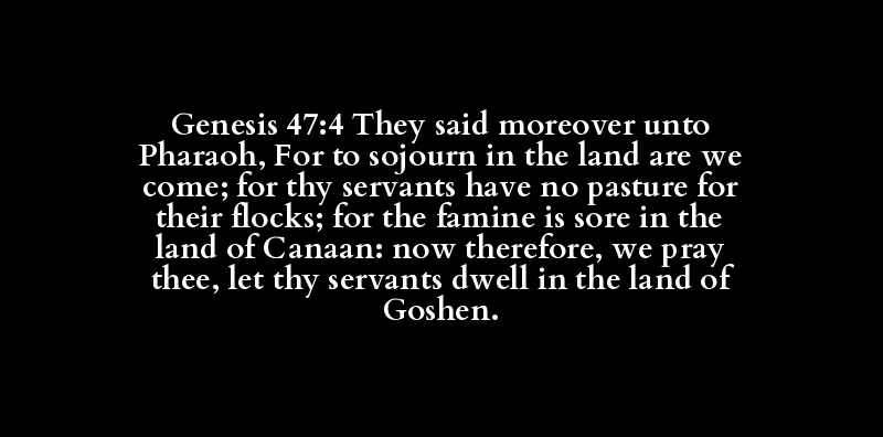 Genesis 47:4 They said moreover unto Pharaoh, For to sojourn in the land are we come; for thy servants have no pasture for their flocks; for the famine is sore in the land of Canaan: now therefore, we pray thee, let thy servants dwell in the land of Goshen.