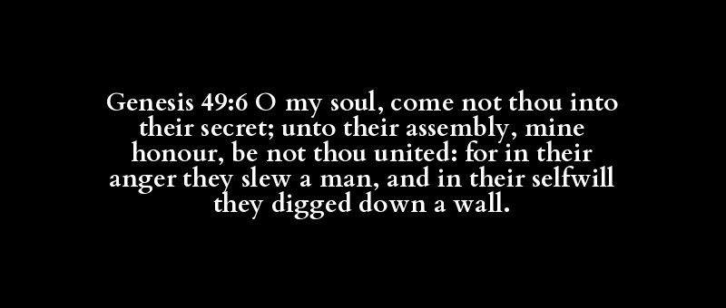 Genesis 49:6 O my soul, come not thou into their secret; unto their assembly, mine honour, be not thou united: for in their anger they slew a man, and in their selfwill they digged down a wall.