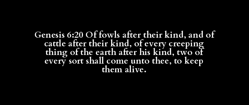 Genesis 6:20 Of fowls after their kind, and of cattle after their kind, of every creeping thing of the earth after his kind, two of every sort shall come unto thee, to keep them alive.