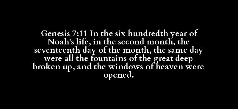 Genesis 7:11 In the six hundredth year of Noah's life, in the second month, the seventeenth day of the month, the same day were all the fountains of the great deep broken up, and the windows of heaven were opened.