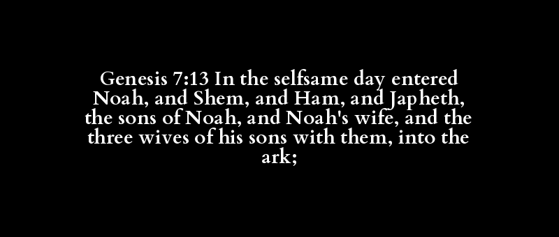 Genesis 7:13 In the selfsame day entered Noah, and Shem, and Ham, and Japheth, the sons of Noah, and Noah's wife, and the three wives of his sons with them, into the ark;