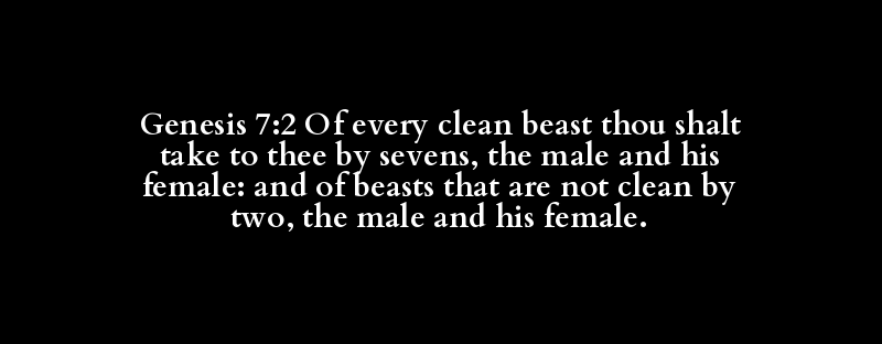 Genesis 7:2 Of every clean beast thou shalt take to thee by sevens, the male and his female: and of beasts that are not clean by two, the male and his female.