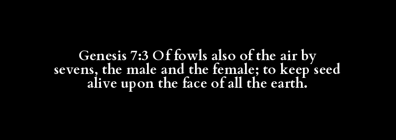 Genesis 7:3 Of fowls also of the air by sevens, the male and the female; to keep seed alive upon the face of all the earth.