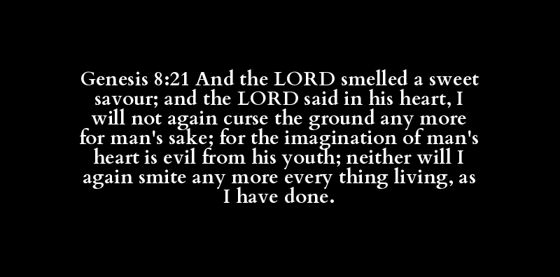 Genesis 8:21 And the LORD smelled a sweet savour; and the LORD said in his heart, I will not again curse the ground any more for man's sake; for the imagination of man's heart is evil from his youth; neither will I again smite any more every thing living, as I have done.