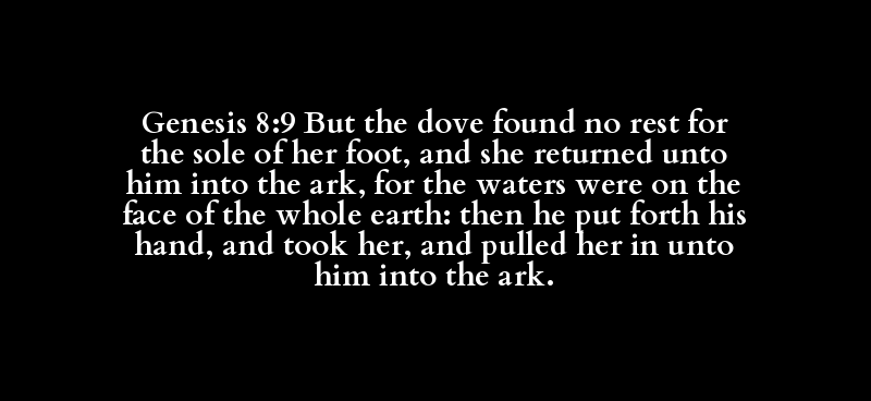 Genesis 8:9 But the dove found no rest for the sole of her foot, and she returned unto him into the ark, for the waters were on the face of the whole earth: then he put forth his hand, and took her, and pulled her in unto him into the ark.