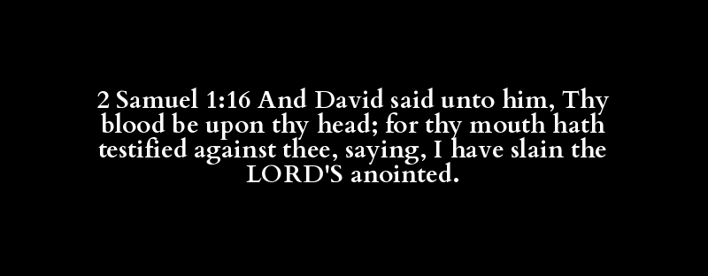 2 Samuel 1:16 And David said unto him, Thy blood be upon thy head; for thy mouth hath testified against thee, saying, I have slain the LORD'S anointed.