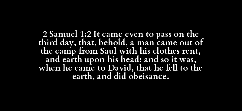 2 Samuel 1:2 It came even to pass on the third day, that, behold, a man came out of the camp from Saul with his clothes rent, and earth upon his head: and so it was, when he came to David, that he fell to the earth, and did obeisance.