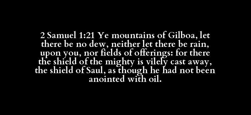 | הַר | גִּלְבֹּעַ | טַל | מָטַר | שָׂדֶה | תְּרוּמָה | מָגֵן | גִּבּוֹר | גָּעַל | מָגֵן | שָׁאוּל | מָשִׁיחַ | שֶׁמֶן |