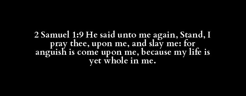 2 Samuel 1:9 He said unto me again, Stand, I pray thee, upon me, and slay me: for anguish is come upon me, because my life is yet whole in me.