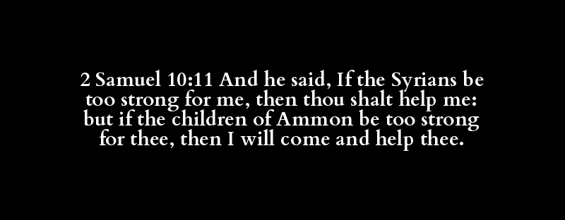 2 Samuel 10:11 And he said, If the Syrians be too strong for me, then thou shalt help me: but if the children of Ammon be too strong for thee, then I will come and help thee.