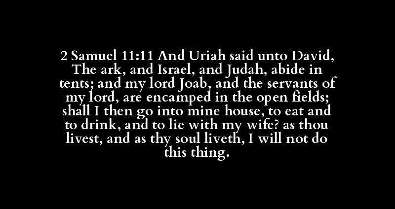 2 Samuel 11:11 And Uriah said unto David, The ark, and Israel, and Judah, abide in tents; and my lord Joab, and the servants of my lord, are encamped in the open fields; shall I then go into mine house, to eat and to drink, and to lie with my wife? as thou livest, and as thy soul liveth, I will not do this thing.