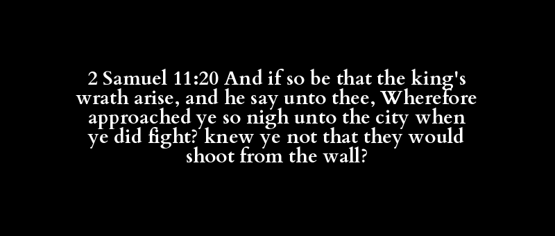 2 Samuel 11:20 And if so be that the king's wrath arise, and he say unto thee, Wherefore approached ye so nigh unto the city when ye did fight? knew ye not that they would shoot from the wall?