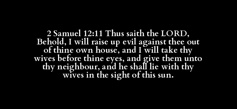 2 Samuel 12:11 Thus saith the LORD, Behold, I will raise up evil against thee out of thine own house, and I will take thy wives before thine eyes, and give them unto thy neighbour, and he shall lie with thy wives in the sight of this sun.