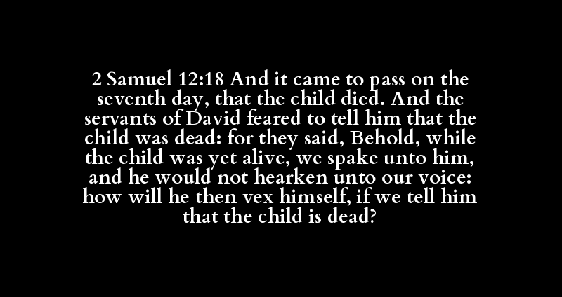 2 Samuel 12:18 And it came to pass on the seventh day, that the child died. And the servants of David feared to tell him that the child was dead: for they said, Behold, while the child was yet alive, we spake unto him, and he would not hearken unto our voice: how will he then vex himself, if we tell him that the child is dead?