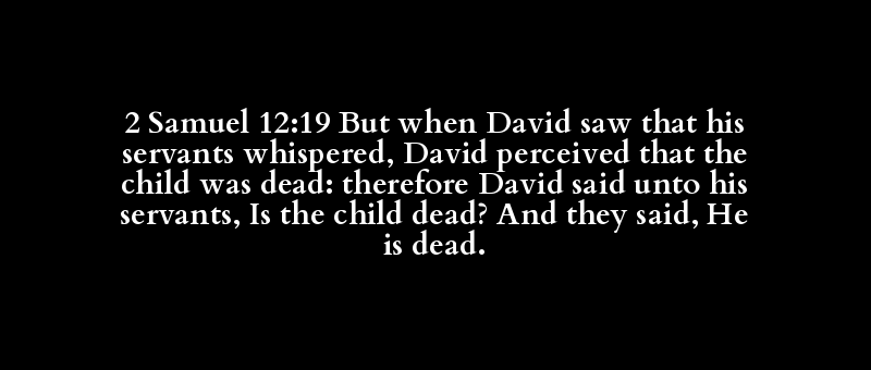 2 Samuel 12:19 But when David saw that his servants whispered, David perceived that the child was dead: therefore David said unto his servants, Is the child dead? And they said, He is dead.