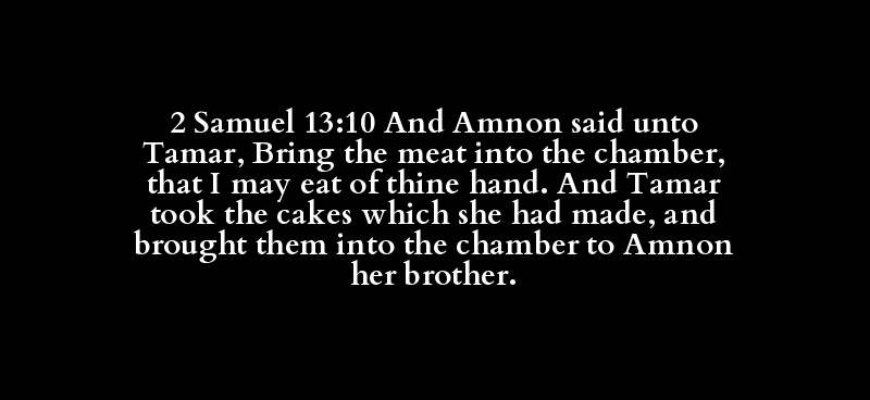 2 Samuel 13:10 And Amnon said unto Tamar, Bring the meat into the chamber, that I may eat of thine hand. And Tamar took the cakes which she had made, and brought them into the chamber to Amnon her brother.