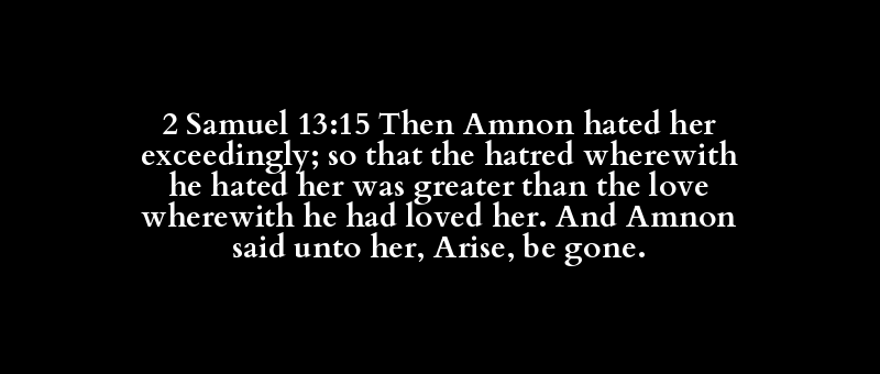 2 Samuel 13:15 Then Amnon hated her exceedingly; so that the hatred wherewith he hated her was greater than the love wherewith he had loved her. And Amnon said unto her, Arise, be gone.